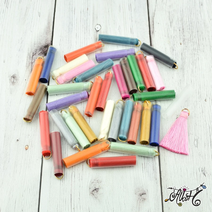Igazi színkavalkád, puha selyemfényű cérna bojt válogatás a képen látható vegyes színekben, arany színű szerelőkarikával.