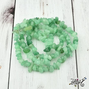 Természetes zöld aventurin ásvány splitter. Az ásványok változatos méretűek, nagyjából 5-8 mm hosszúak, 2-7 mm szélesek. Az ásványon lévő lyuk mérete 1 mm. A szál hossza kb. 80 cm. Az ár 1 db ásvány füzérre vonatkozik.  |