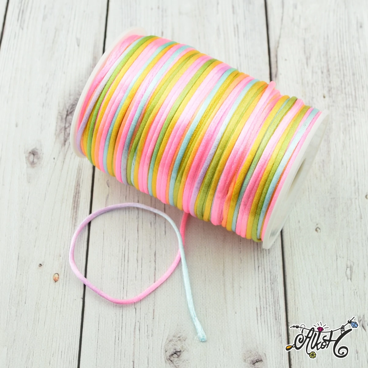 Színátmenetes, sárgás-kékes-rózsaszínes színű, 2 mm vastagságú szatén zsinór.